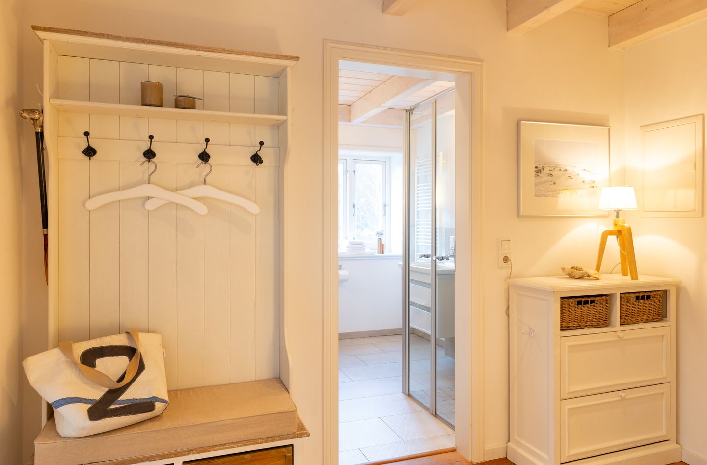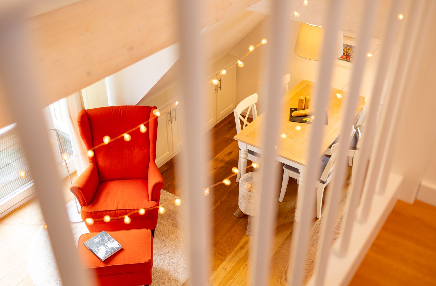 Im Wohnbereich sorgt ein Kaminofen für behagliche Stunden. Weiterhin stehen Ihnen ein modernes TV-Gerät (35–44 Zoll), ein Radio, WLAN sowie eine kleine Bücherauswahl und Gesellschaftsspiele für entspannte Stunden zur Verfügung. Für Ihren Komfort finden Sie außerdem einen Sessel, ein Sofa, eine Garderobe, einen Schuhschrank sowie Stauraummöglichkeiten wie Kommoden.