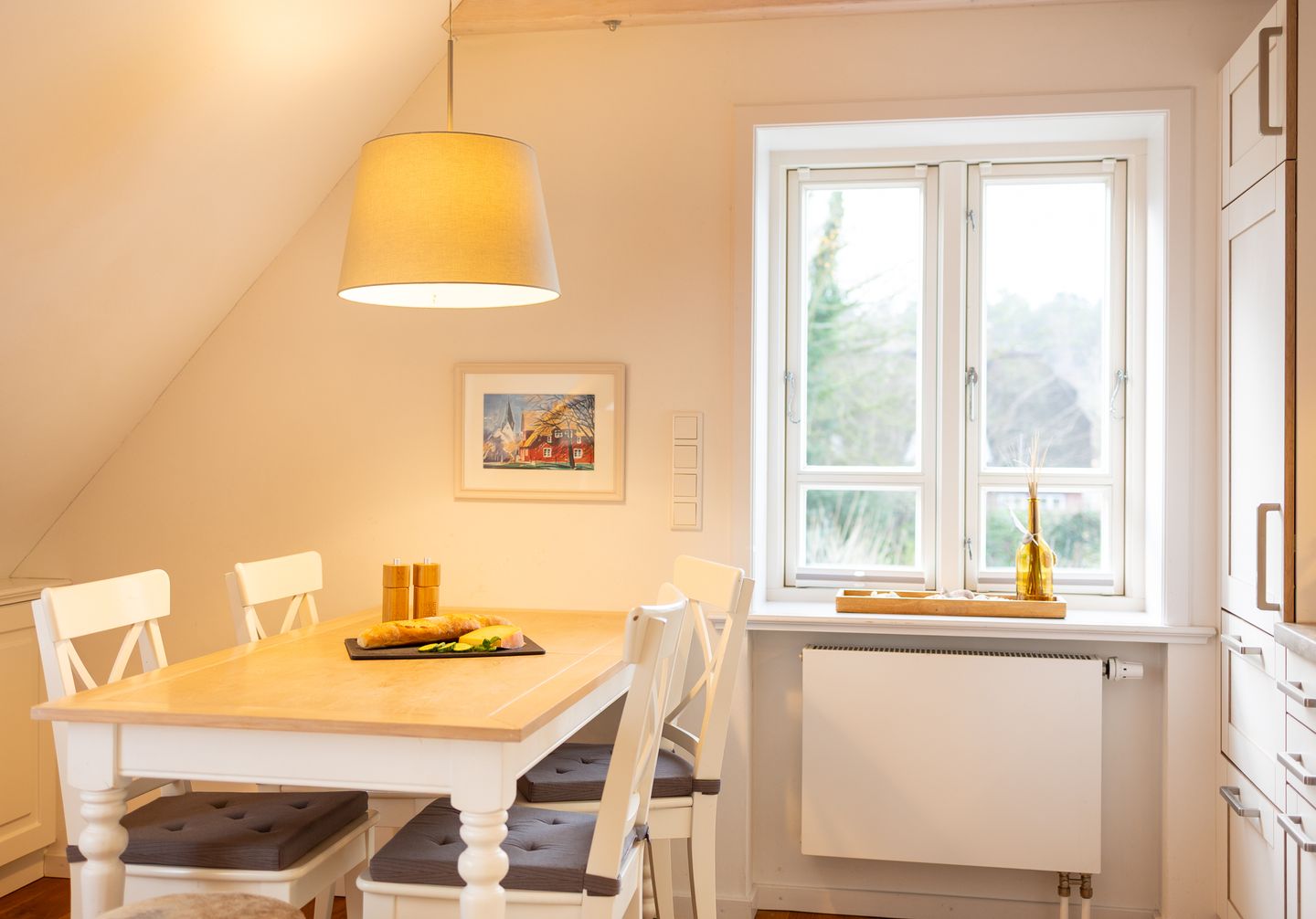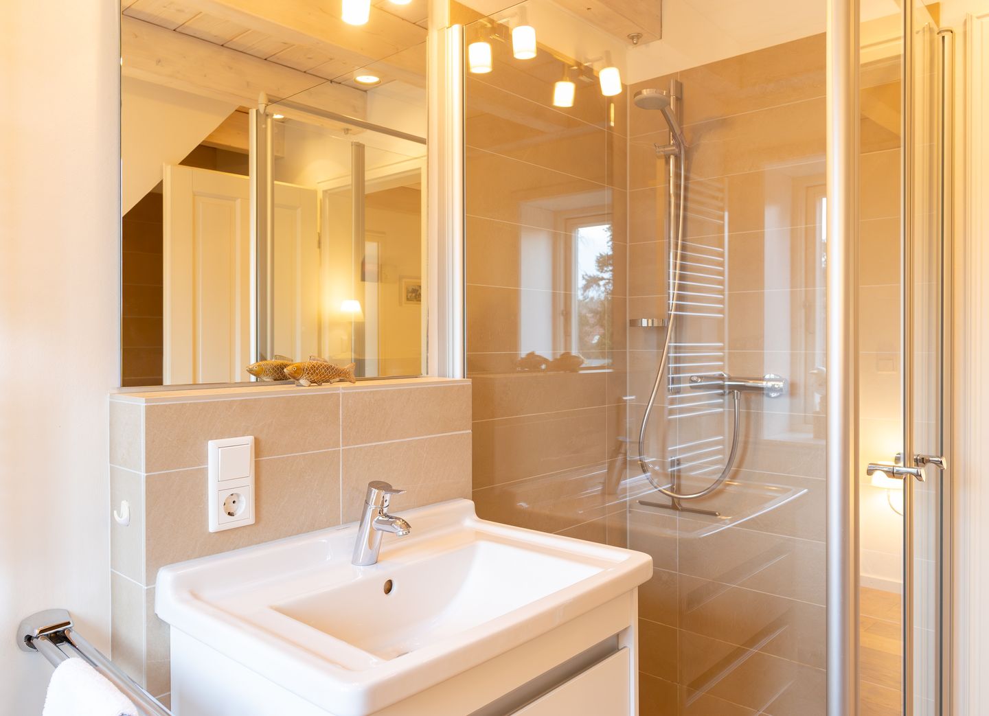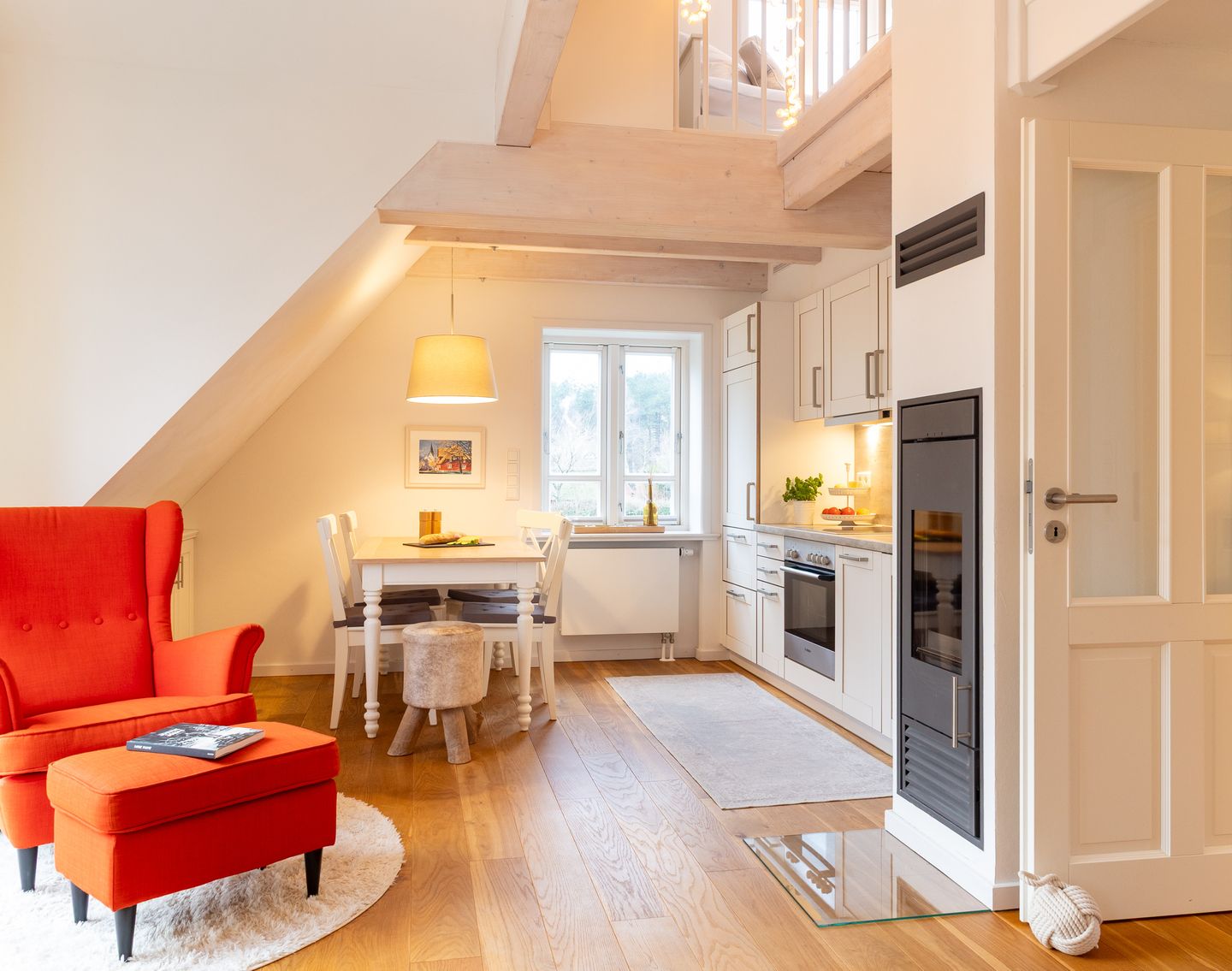 Im offen zum Wohnzimmer gestalteten Küchenbereich finden Sie eine hochwertige Ausstattung vor: Ceranherd, Backofen, Spülmaschine, Mikrowelle, Kühlschrank mit Gefrierfach, Kaffeemaschine, Toaster, Wasserkocher sowie sämtliches Geschirr und Küchenutensilien stehen Ihnen zur Verfügung. Ein großzügiger Essbereich mit Esstisch und komfortabler Sitzgelegenheit schließt sich direkt an, ideal für gemeinsame Mahlzeiten.